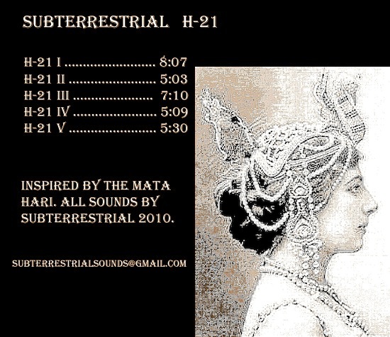 Subterrestrial's "H-21" is inspired by early 20th century exotic dancer Mata Hari, who was executed for treason in France during World War I after being accused of spying for Germany. Subterrestrial uses harsh, 8-bit noise and heavily aliased exotic rhythms to explore her often violent life and tragic death. It is believed that she was wrongly accused of her crime and made a scapegoat. H-21 was her alleged codename.