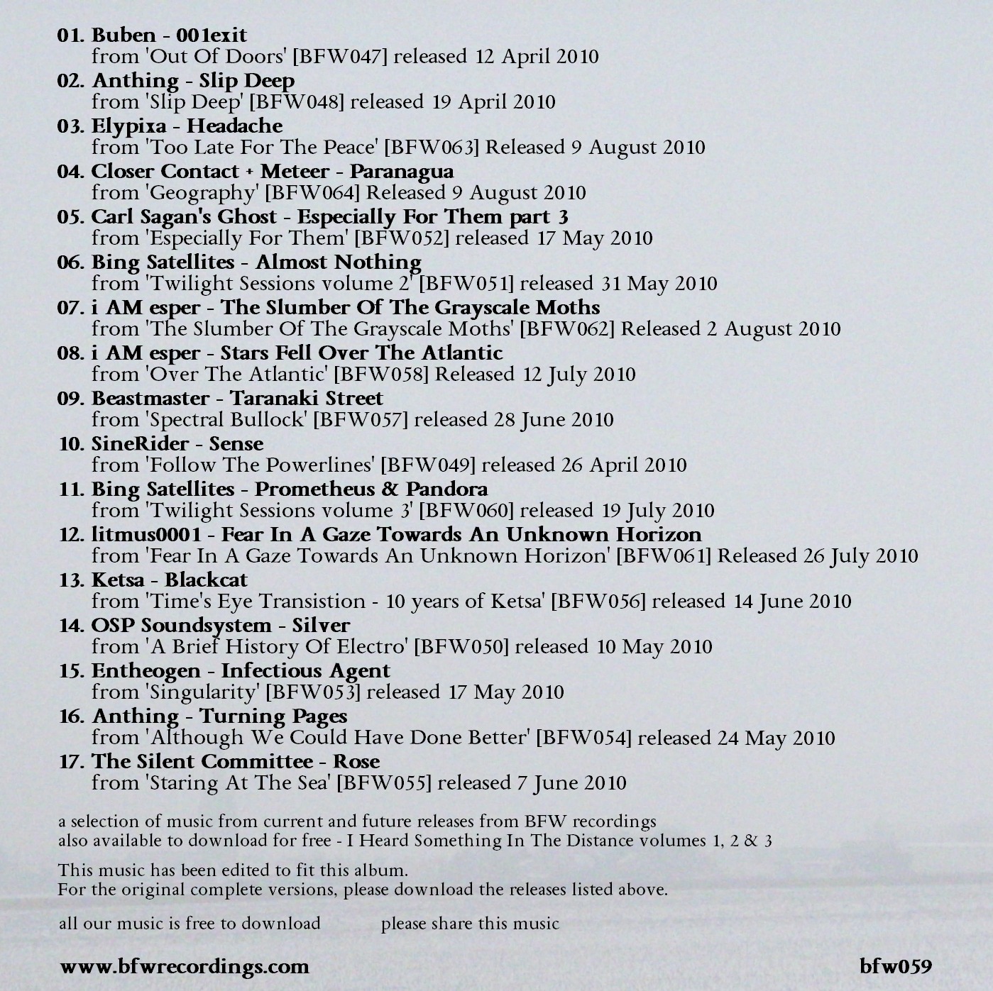Released on Artists Catalog number BFW059 Playtime: 01:26:39 - 192kb/s - 97.48 MB Date released 2010/07/19 Date published 2010/07/18 23:53h Downloads 8704 |