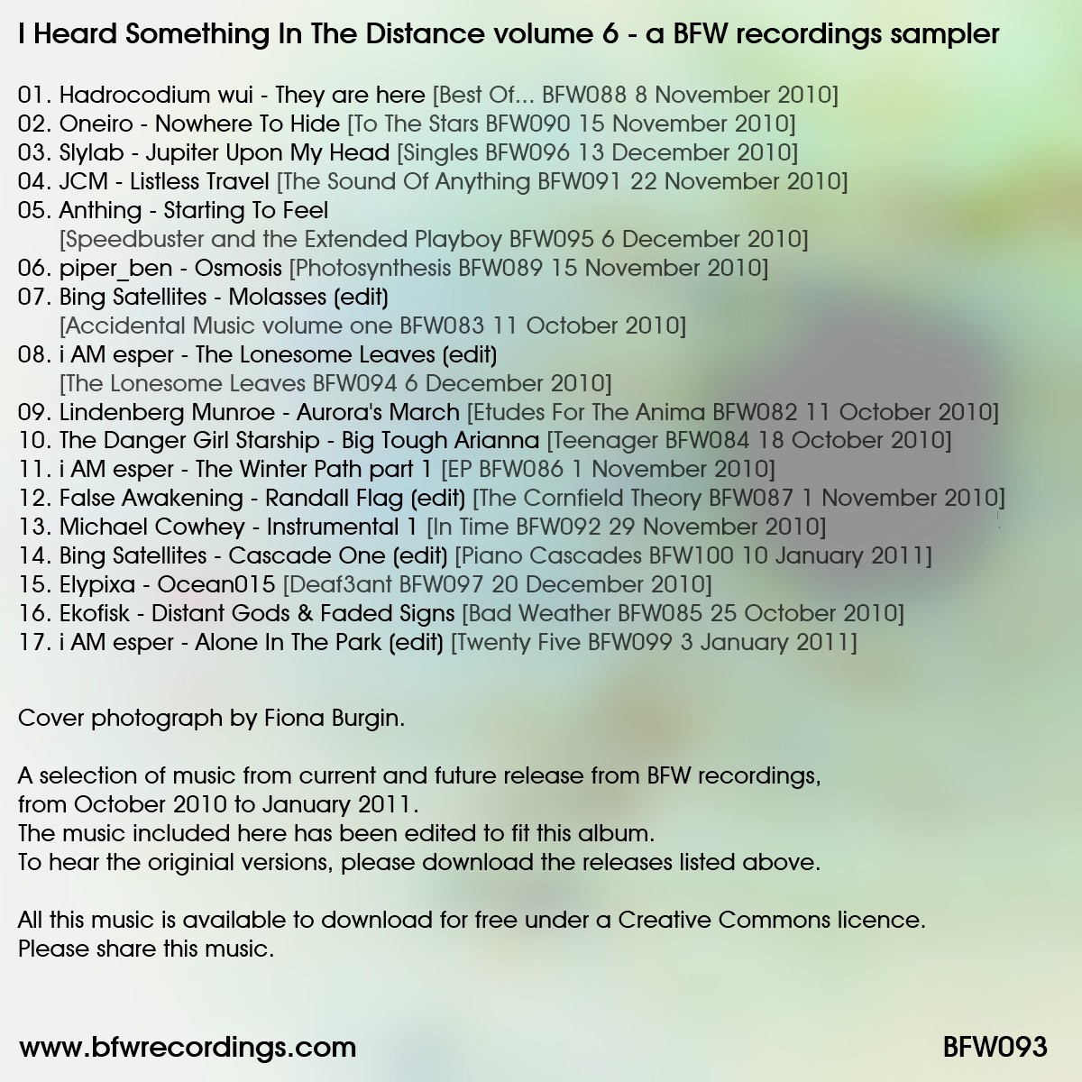 The sixth compilation from BFW recordings, featuring music from current and future BFW releases, from October 2010 to January 2011. This is a great album - a fantastic, rich and eclectic mix of music - soft pianos, warm ambient, glitchy beats, guitar drones, ambient shoegaze pop (yes, we've decide that is a genre!) and much more - all available to download for free from BFW recordings. Cover photograph by Fiona Burgin.