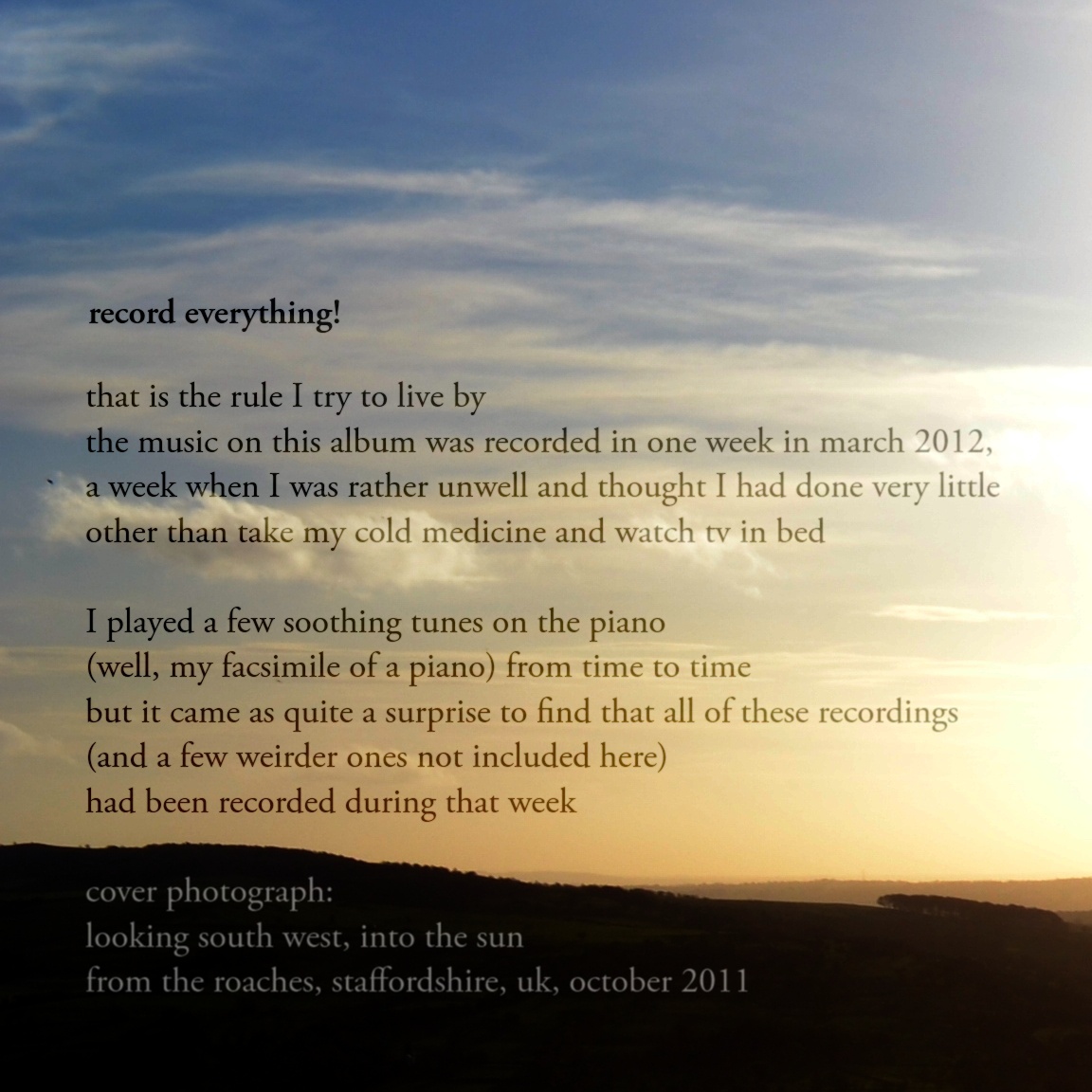 The music on this album was recorded in one week in March 2012, a week when I was rather unwell and thought I had done very little other than take my cold medicine and watch TV in bed.