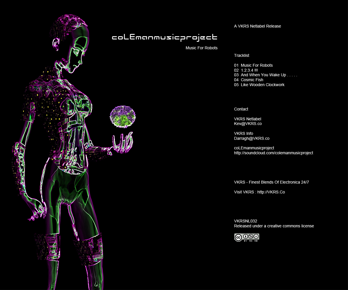 VKRS Radio and Netlabel are pleased to present coLEmanmusicproject - Music For Robots. " Listen with an open mind, and let the sounds fill the emptiness in an amorphous electronic massaging kind of a way."
