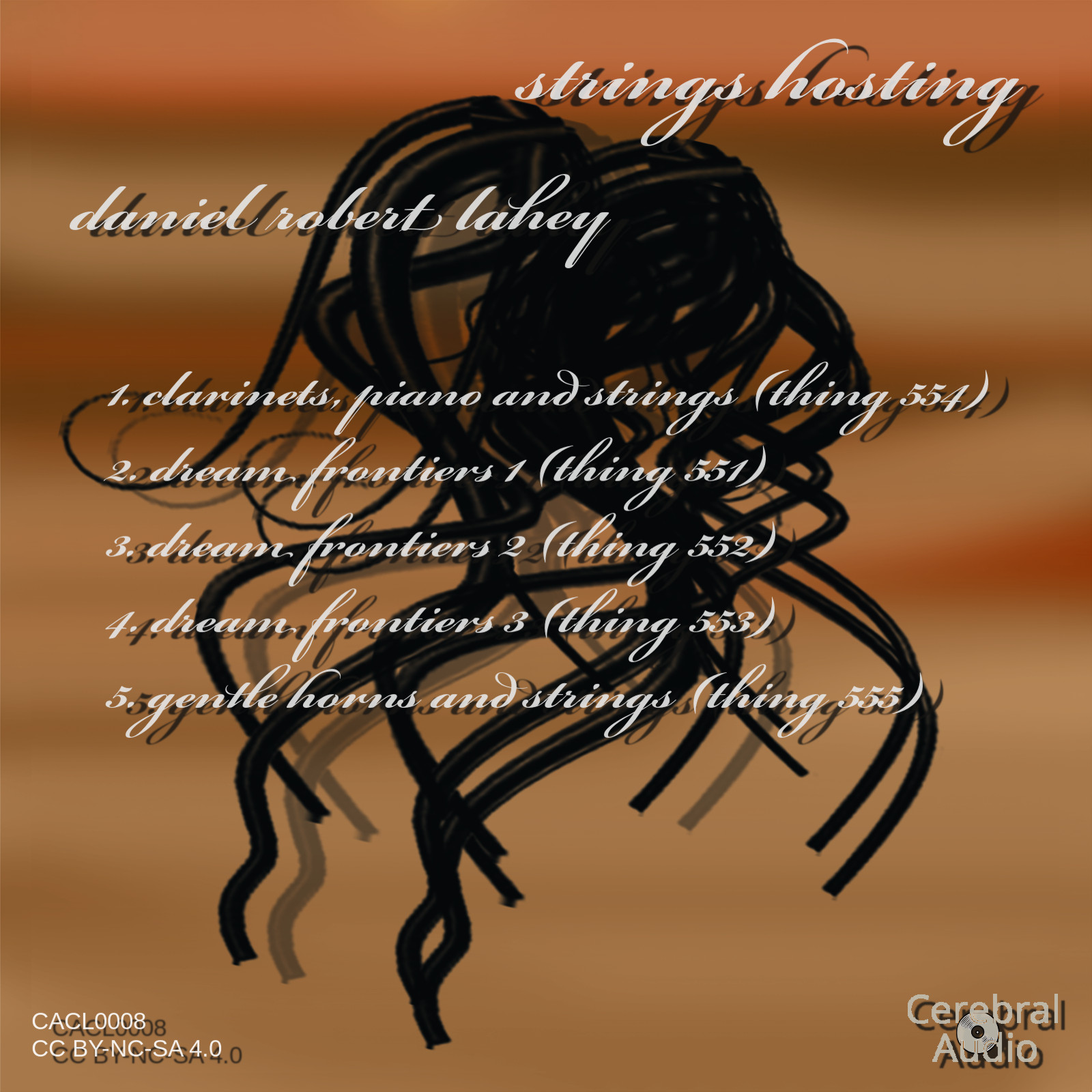 Daniel Robert Lahey's "Strings Hosting" features five pieces in the intersection between ambient music and post-modernist classical music. In "Clarinets, Piano and Strings (Thing 554)" the composer takes the listener on a lively and sometimes dissonant tour of the three named instruments. The latter two of the three pieces entitled "Dream Frontiers 1 (Thing 551)", "Dream Frontiers 2 (Thing 552)" and "Dream Frontiers 3 (Thing 553)" explore tone and melody in a fresh and often delightful way. Each features appealing melodies presented without the burden upon the listener of any cloying sweetness. The album concludes with "Gentle Horns and Strings (Thing 555)", a piece with a feeling of remote majesty that hearkens back a bit to Sibelius. The five pieces of "Strings Hosting" fit neatly together, providing a blend of disparate sounds and styles that make for a good listen.