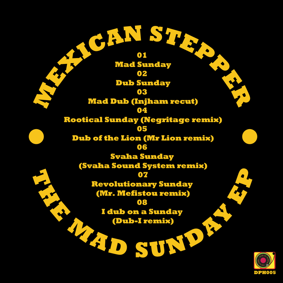 Mexican Stepper’s first EP consists of the title track “Mad Sunday”, a hard stepper tune with an ethnic feel, accompanied by an ever so exiting dub cut. Just to step it up a bit more, we included some exclusive remixes by artists who were already introduced on previous releases like Dub-I (RUS) and Negritage (ARG), but also by Dubophonic newcomers Svaha Sound System (UK), Injham (FR), Mr. Lion AKA Jahstyle (CAN) and Mr Mefisto (PR).