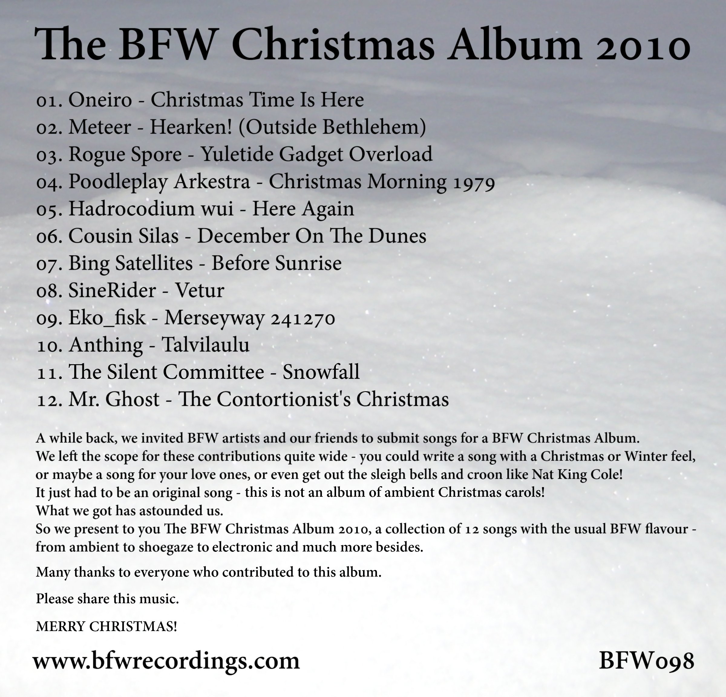 A while back, we invited BFW artists and our friends to submit songs for a BFW Christmas Album. We left the scope for these contributions quite wide - you could write a song with a Christmas or Winter feel, or maybe a song for your love ones, or even get out the sleigh bells and croon like Nat King Cole! It just had to be an original song - we aren't doing an album of ambient Christmas carols! What we got has astounded us. So we present to you The BFW Christmas Album 2010, a collection of 12 songs with the usual BFW flavour - from ambient to shoegaze to electronic to downright bonkers! Please share this album with your family and friends. MERRY CHRISTMAS!