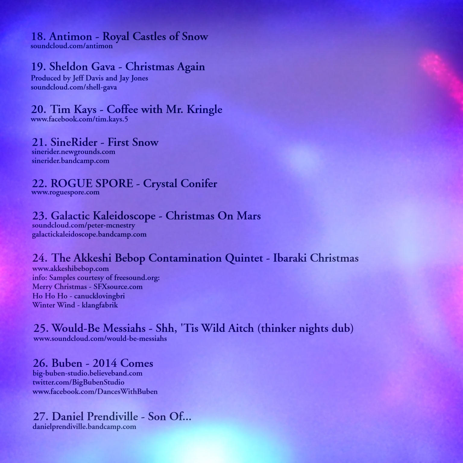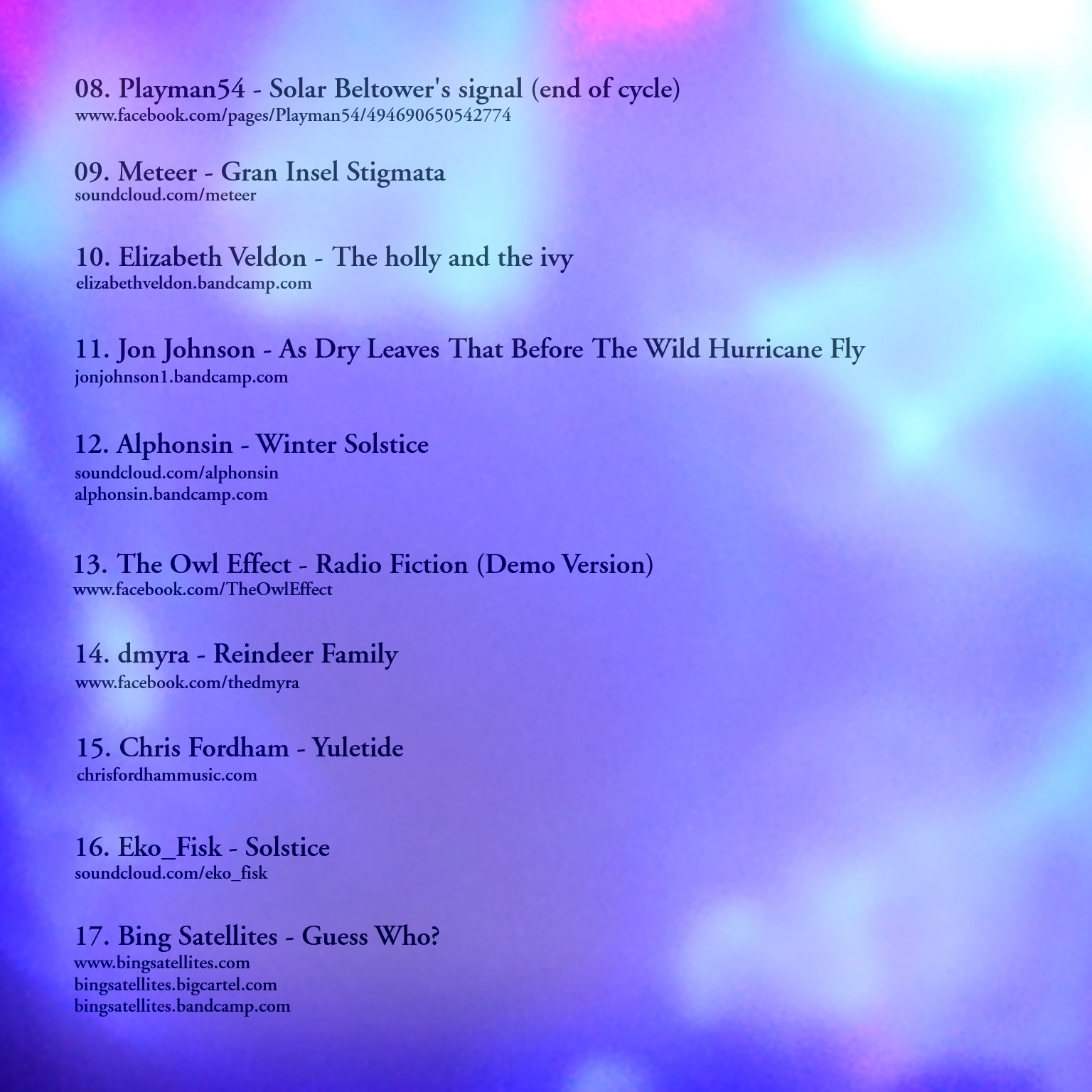 Released on Artists Buben, Bing Satellites, SineRider, Chris Fordham, Cousin Silas, MagicVan, Rogue Spore, Meteer, Ekofisk, Antimon, dmyra, elizabeth Veldon, Jon Johnson, Magnetic Wind, Mystified, Midnightradio11, Scott Lawlor, Would-Be Messiahs, Daniel Prendiville, The Amygdala, Ade Hodges, The Owl Effect, Luciftias, Sheldon Gava, Peter Edwards, Perceptual Defence and Uzbazur345, When We Live, Uzbazur345 and Perceptual Defence, The Akkeshi Bebop Contamination Quintet, Ars Sonor, TOTAL ET, Galactic Kaleidoscope, Alphonsin, Playman54, Tim Kays, Mr Tinkoble, Catalog number BFW218 Playtime: 03:27:25 - 320kb/s - 388.91 MB Date released 2013/12/16 Date published 2013/12/16 19:34h Downloads 14233 |