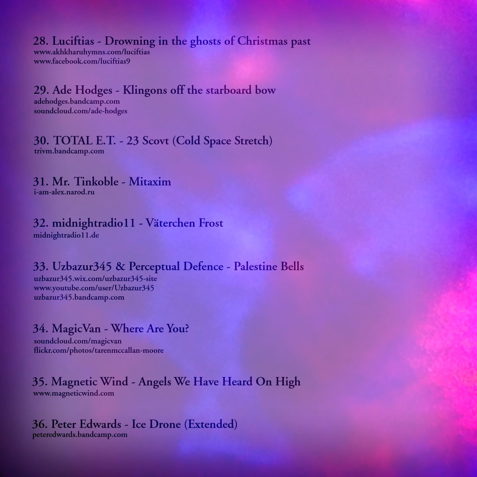 experimentalambientelectronicindiedronedark ambientfield recordingssoundscapechristmaspsyambient shoegaze