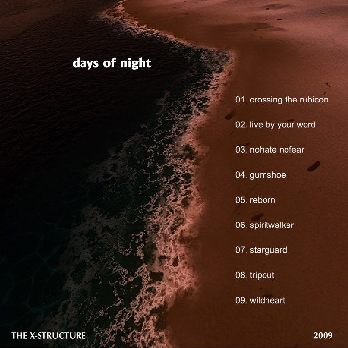 days of night by The X-Structure ---------- Foreword by Starrzan days of night, also known as days of nightowl, was written somewhere between 2006 and 2007 when nightowl was still venturing alone on his journey through life's many events and perplexing questions. His discoveries during that time would later prove invaluable to The X-Structure's future missions and cleared the way forward for the rest to see that through the darkness in life the light illuminates the goodness throughout it. This album retells some of these stories where he found his name and the days were as night. days of night Nightowl sat perched on the rocky outcrop of the high peak he had just scaled. Catching his breath he studied the view. He sat in awe staring at the giant structures jetting out from the ground. Their presence putting his being into perspective. The sky was a perfect blue. He was somewhere in the wild mountains of the Cape. It had been a tough hike to the top but he made it in the end. As the sun lazily began dropping to the horizon nightowl sat contemplating his life and the events that had brought him to this point. Life had not always been pleasant or easy for him, he recalled. Throughout his early years he had struggled with himself and the acceptance of who he was. There came a stage where he could not bear it any longer. That's when he changed. Not by his own strength or will did this happen. It was something else. Something he had discarded many years before. Something he had never really understood. In his darkest hour he had cried out for help to someone, to someone greater than him, to someone he had left for dead. Then it happened. In the dead of night he was saved from his inner turmoil. Saved by one who he would come to know as his greatest friend and companion. Their adventures together would go on far beyond what he had ever understood to be. So who was this mystery saviour? This ultimate friend? It was in fact, as you might have guessed by now, his creator. The one who had given nightowl the gift of life. The sun had by now left for the day. Nightowl shifted his position on the rock. He now lay flat on his back using his backpack as a cushion. The stars were there as they always were. Another sign from his constant companion. He searched the sky for his favourite star. There it was. He found it. The Dog Star, Canis Major, was shinning brightly from its corner in space, Orion's belt always close by. The Southern Cross was not visible yet so he'd have to wait till his favoured constellation came into view. Nightowl was grateful for life and the ability to perceive it. He was grateful for the life he had been given and the understanding he now had of it. After the dark times he went through he really understood the good times, illuminated by the light he now saw. He still faced bad things and would most definitely still face many more, but he had now learned a deeper truth to it all and would take on those problems for he knew he would overcome them. By midnight the Southern Cross was faithfully pointing the way south. South to where home was. Nightowl smiled and said goodnight. At five the sun started rising over the eastern mountains. Nightowl was awake, the kettle already boiling. He sipped on the steaming coffee, greeting the morning air and the One who had made it. He felt rested and excited for the future, for he knew not what might happen but he knew that whatever happened would be for the good. His hike down was easy for he had the strength to do it and in that to do so much more. It all depended on him if he would use it. He had made his choice and would follow it wherever the Spirit of adventure led him.